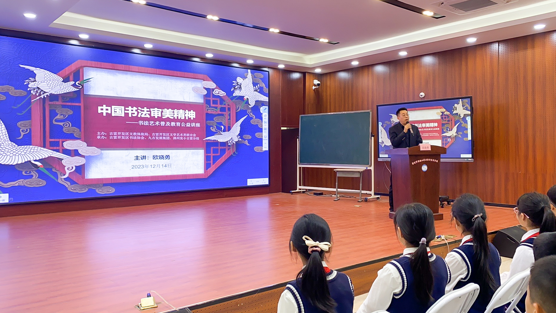 12月14日,由古雷開發(fā)區(qū)管委會(huì)文教體旅局、古雷開發(fā)區(qū)文學(xué)藝術(shù)界聯(lián)合會(huì)主辦,古雷開發(fā)區(qū)書法協(xié)會(huì)、九古發(fā)展集團(tuán)、漳州實(shí)小古雷分校共同承辦的“傳承書法藝術(shù) 共建墨香校園”古雷書協(xié)書法公益講座在漳州實(shí)小古雷分校拉開帷幕,邀請(qǐng)九古發(fā)展集團(tuán)總經(jīng)理助理歐曉勇現(xiàn)場(chǎng)授課,重點(diǎn)圍繞中國(guó)書法審美精神的理解以及中小學(xué)生規(guī)范書寫的重要性等問題進(jìn)行深入闡述,為與會(huì)師生作了一場(chǎng)精彩生動(dòng)的專題講座。