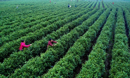 ↑2018年4月28日,貧困戶歷運(yùn)寶在河南省信陽(yáng)市浉河區(qū)一家茶葉生態(tài)觀光園里采摘毛尖。該園區(qū)提供茶葉生產(chǎn)崗位300余個(gè),茶葉生產(chǎn)旺季時(shí)臨時(shí)崗位達(dá)2000余個(gè),帶動(dòng)茶鄉(xiāng)貧困戶脫貧增收。