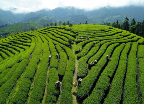 ↑福建武夷山星村鎮(zhèn)朝陽(yáng)村采茶現(xiàn)場(chǎng)(無(wú)人機(jī)照片,2019年4月14日攝)。